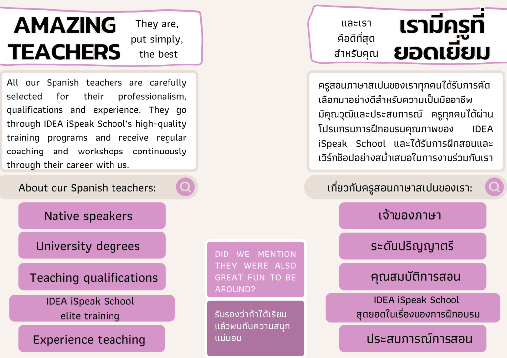 IDEA iSpeak School is a high-end “boutique” language school. We do not only teach languages, we also teach students. What you want and what you need are always at the center of everything we do for you. No other school can deliver the same kind of personalized, high-quality content that we are famous for. All of this makes us Thailand’s leader in high-quality language education.